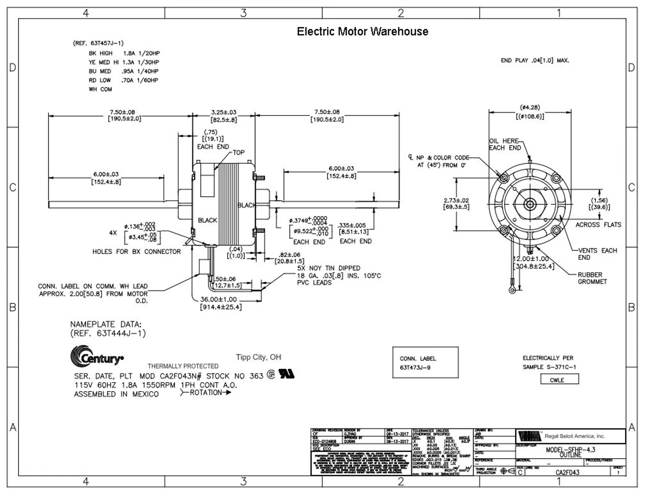 - 1/20 hp 1550 RPM, 4-Speed, 1.8 amps, 115 Volts 60hz.